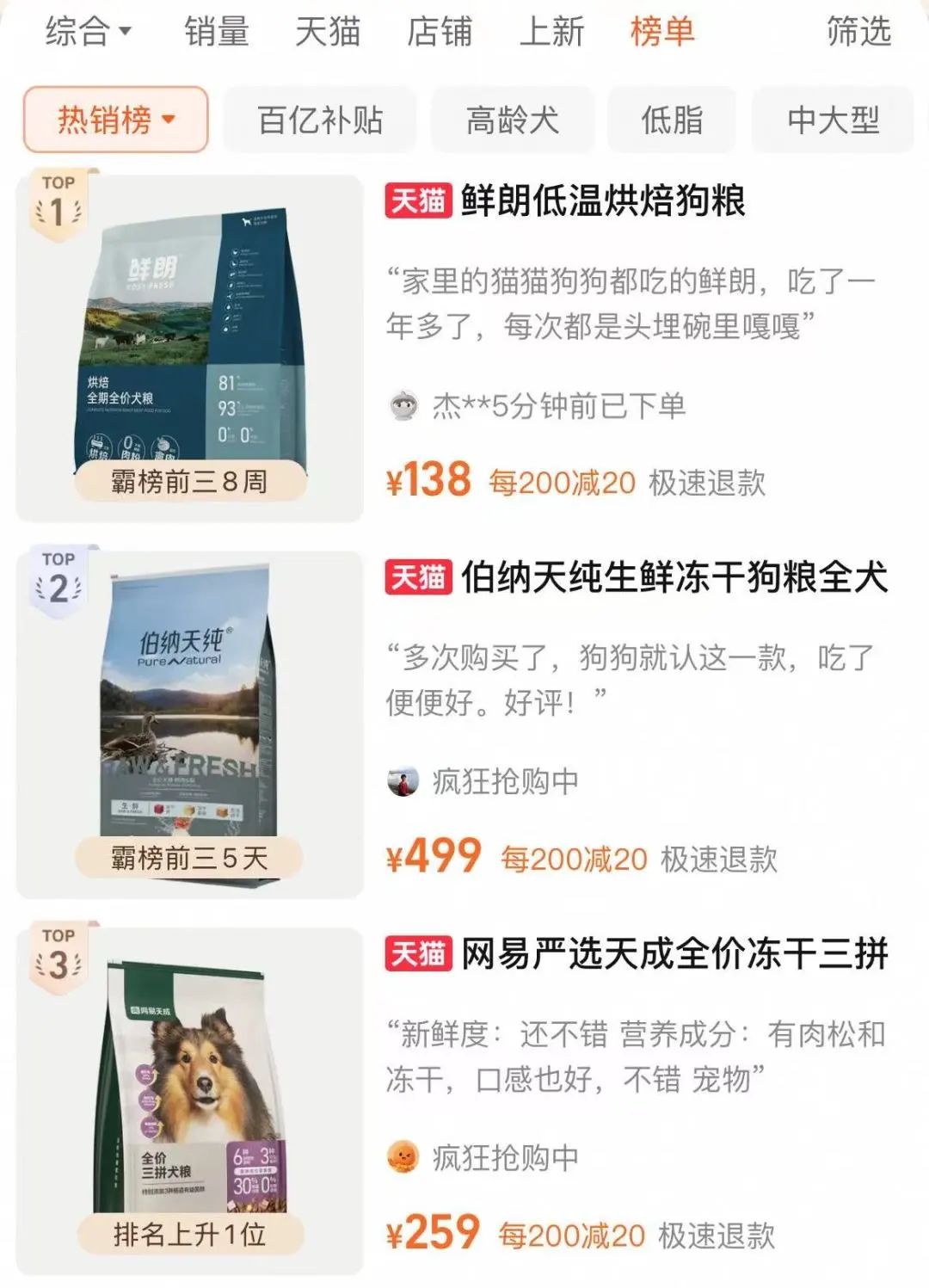 首先,在飲食方面,一改過去由外資寵糧品牌壟斷的局面,近年來主打營銷成分和高性價比的國產(chǎn)品牌開始受到了更多關(guān)注。打開淘寶的狗糧熱銷榜,排名前三的均為國內(nèi)品牌。