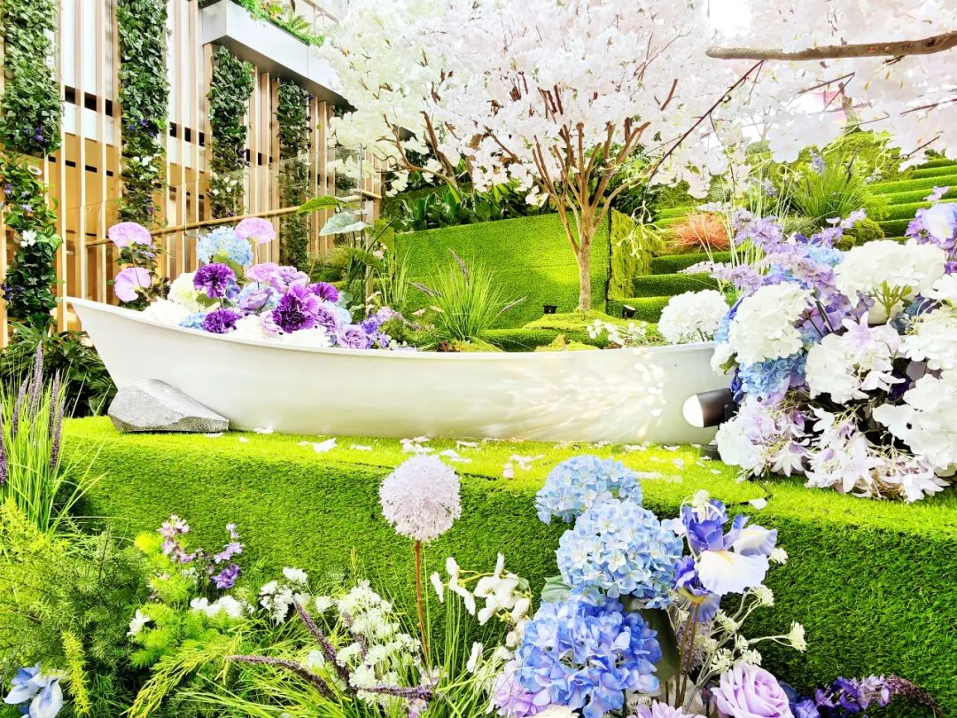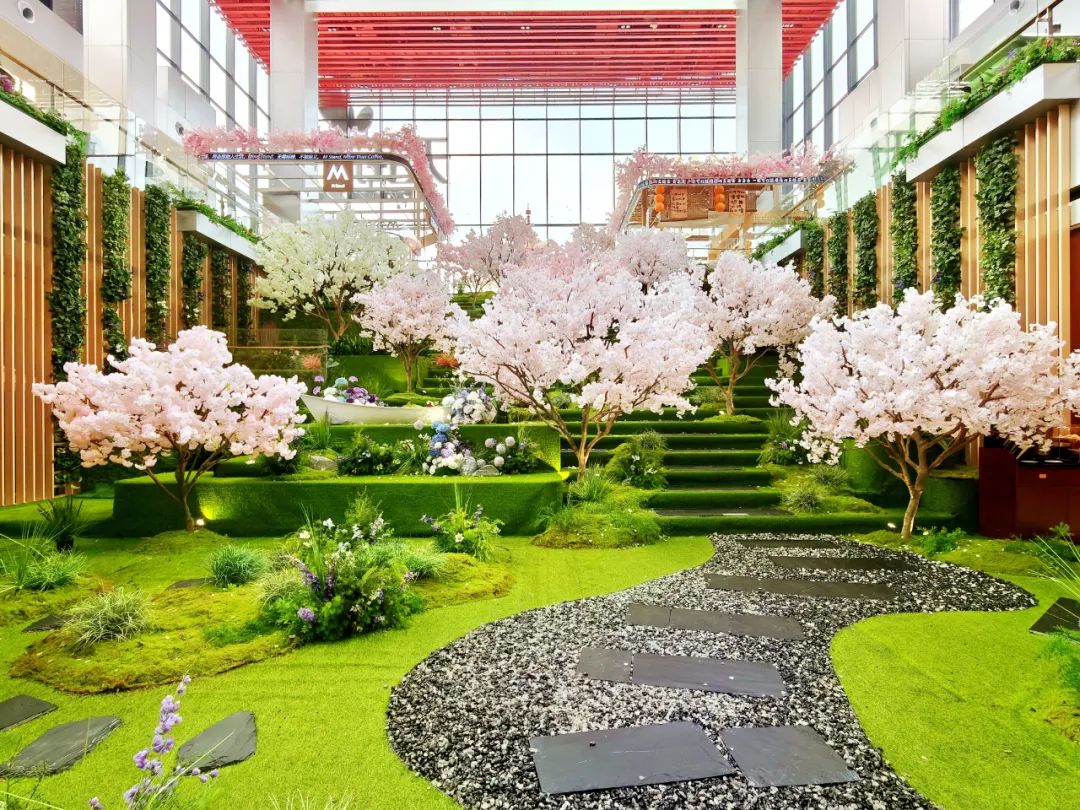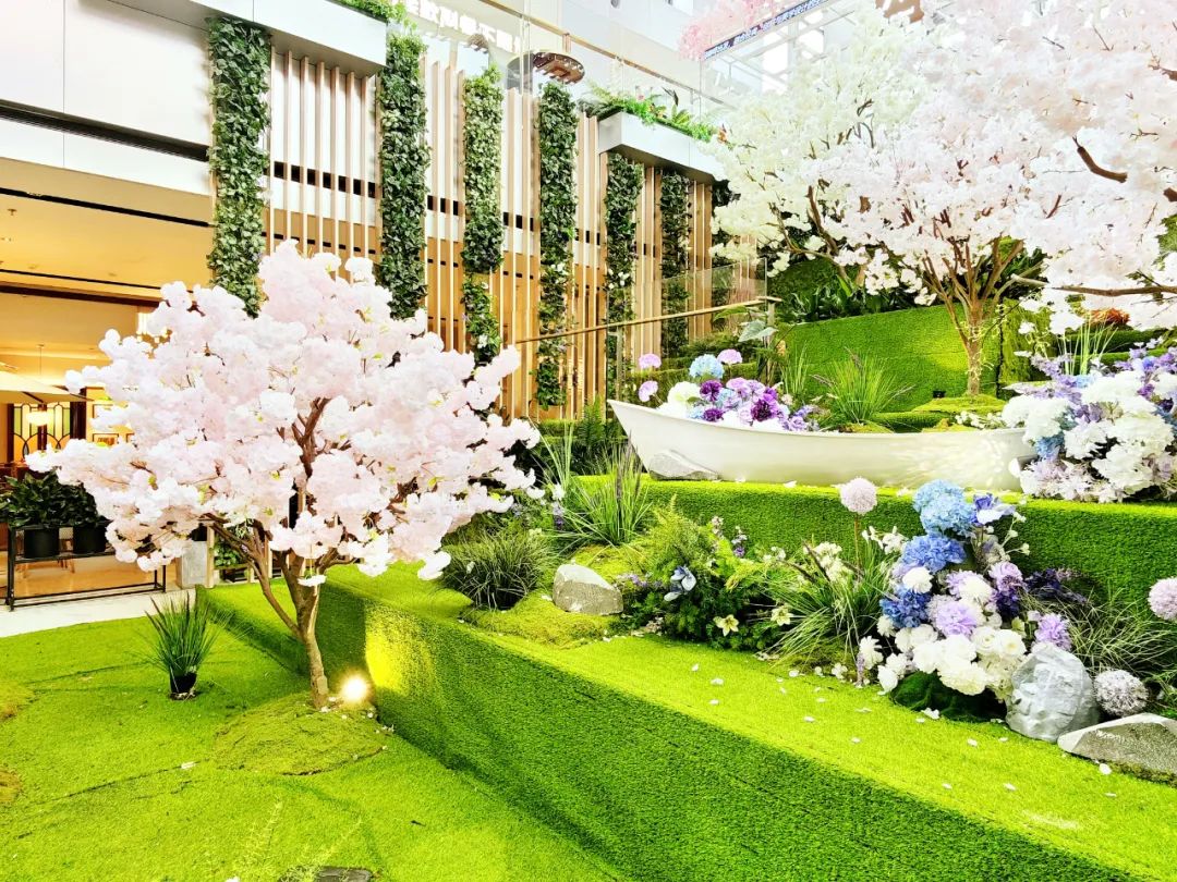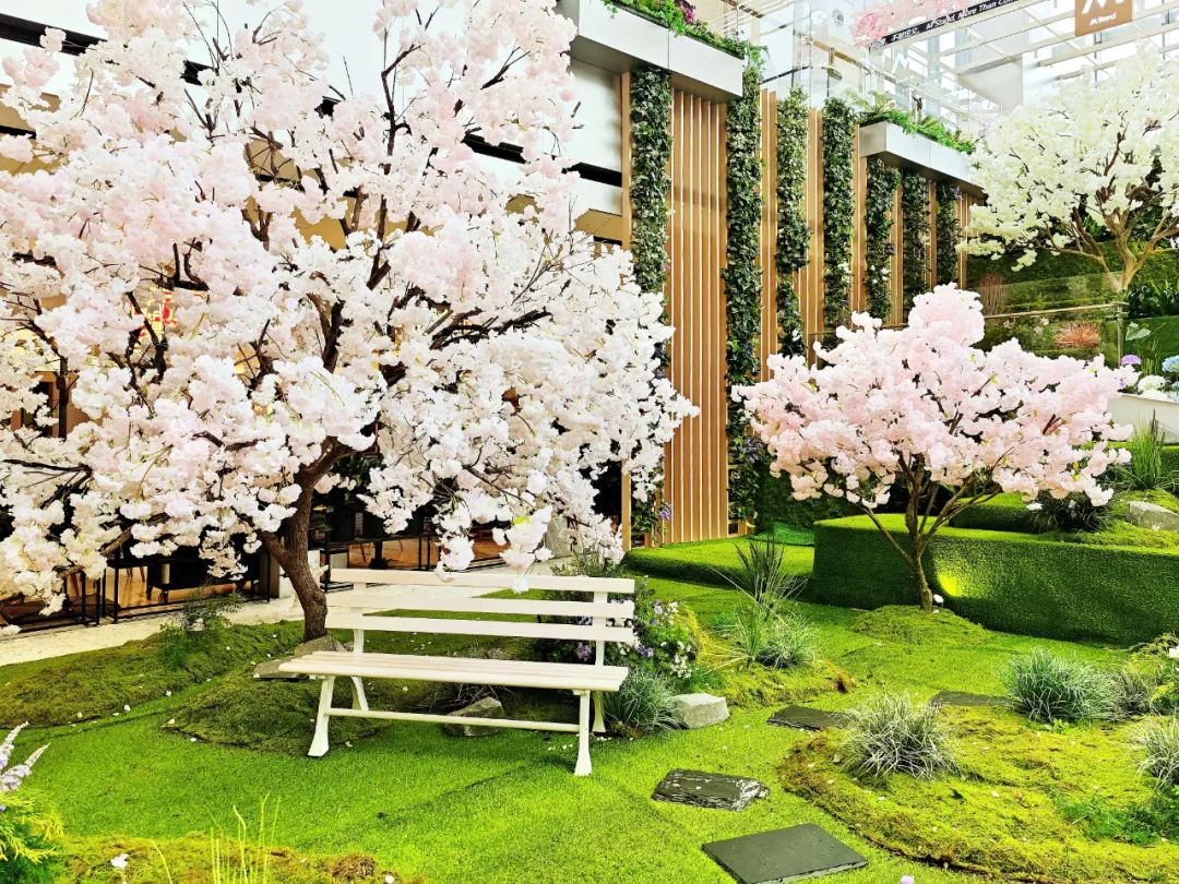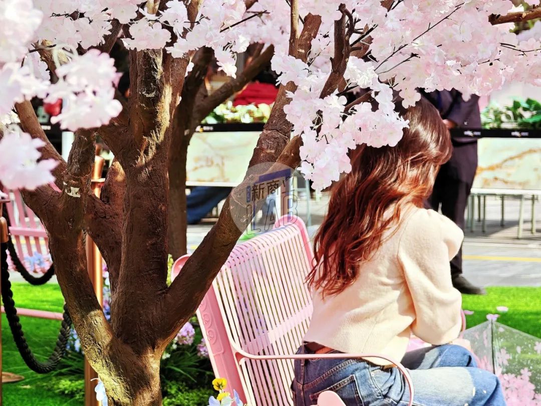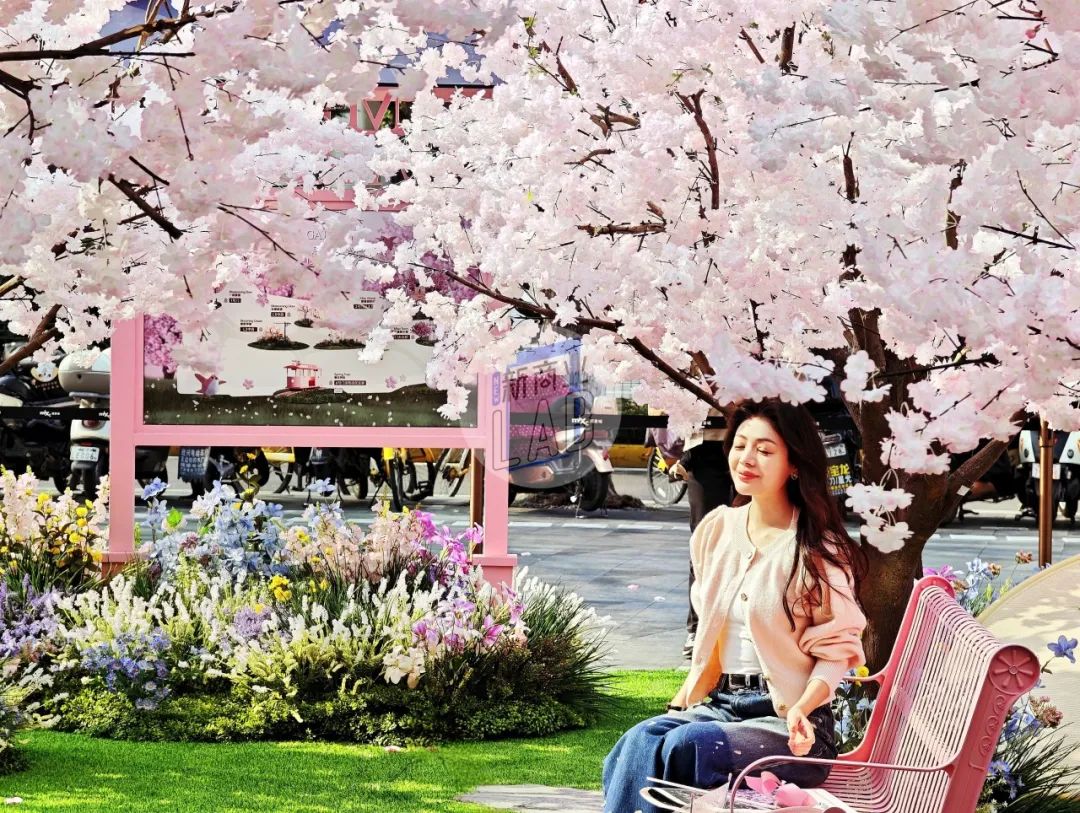 在外廣場、L1中庭、戶外大臺階、街區(qū)連廊等多處空間,「一顆繁櫻、春野浮綠、光影幻境、春日列車、春櫻漫野花園、春櫻漫野小鎮(zhèn)、流光花語」等不同意境且有連貫性的主題氛圍,構(gòu)成了一條可在商場內(nèi)CityWalk的春日漫游之徑。