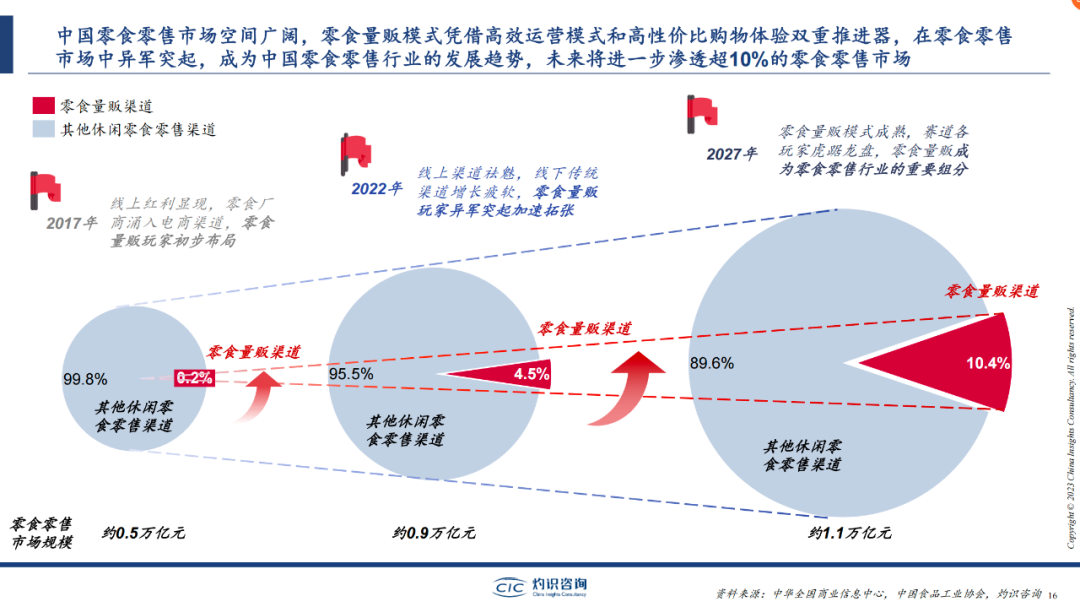 灼識(shí)咨詢數(shù)據(jù)顯示,2022年零食量販渠道在整個(gè)休閑零食渠道的占比在4.5%左右,預(yù)計(jì)到2027年這個(gè)數(shù)字將上升至10.4%,對(duì)應(yīng)的市場(chǎng)規(guī)模在千億元左右。