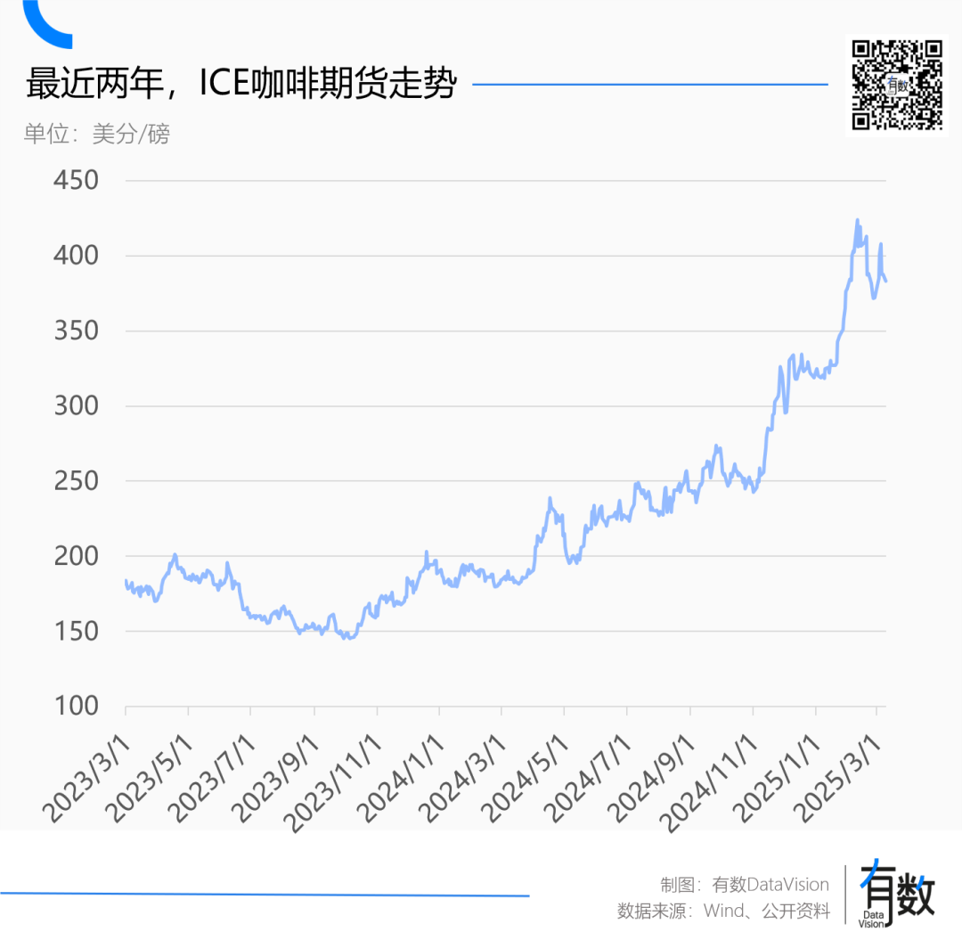 2024年全年,上游咖啡豆?jié)q幅超過70%,原因是巴西與越南因極端天氣大幅減產(chǎn),而兩地供應(yīng)了全球近60%咖啡豆。