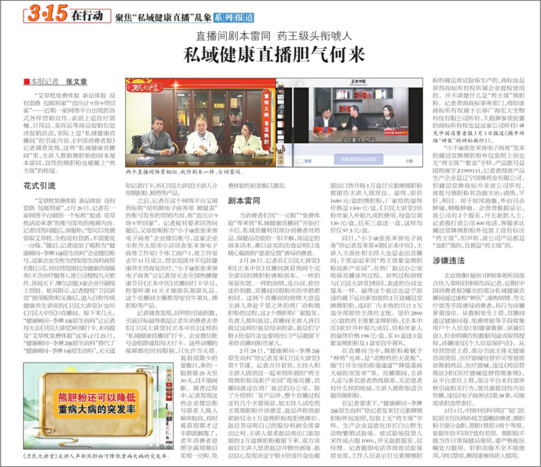 《中國消費者報》3月4日頭版報道了“私域健康直播間”利用促銷信息或促銷活動吸引老年人觀眾,然后借助劇本兜售熊膽粉的典型案例。報道中提到,一些直播間通過發(fā)布“艾草枕免費體驗新品體驗沒有套路包郵到家”“血壓計9塊9帶回家”等促銷內(nèi)容,吸引老年人添加客服人員的企業(yè)微信賬號,隨后被客服拉進“私域健康直播間”,并且要求每天聽課打卡達到一定天數(shù)才能排隊領(lǐng)取禮品。