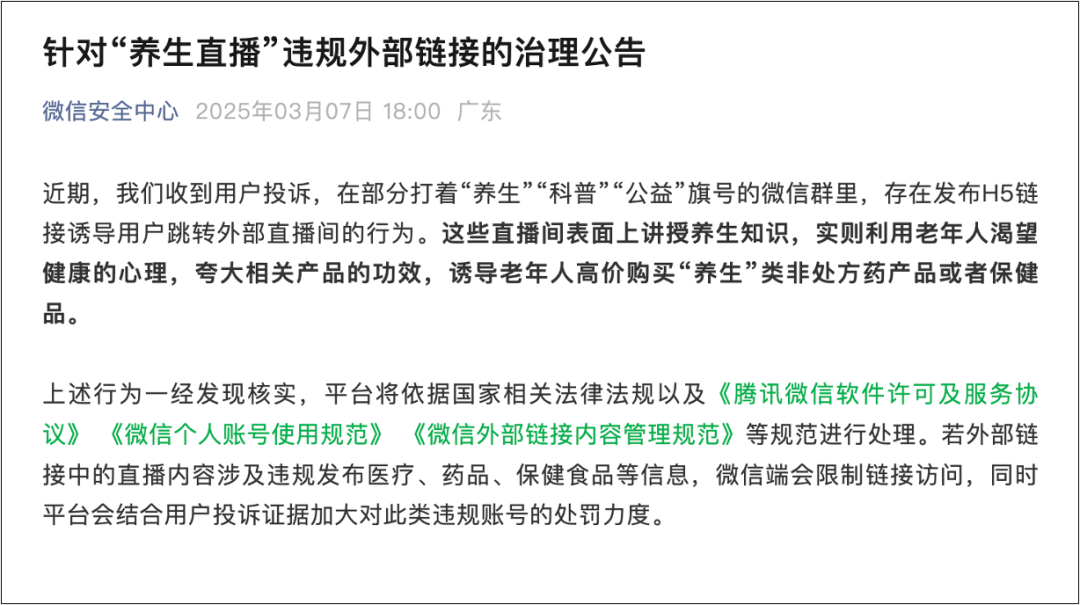 3月7日,微信安全中心發(fā)布公告稱,近期收到用戶投訴,部分打著“養(yǎng)生”“科普”“公益”旗號的微信群,存在通過發(fā)布H5鏈接誘導(dǎo)用戶跳轉(zhuǎn)外部直播間的行為。這些直播間借講授養(yǎng)生知識,利用老年人渴望健康的心理,夸大相關(guān)產(chǎn)品功效,誘導(dǎo)老年人高價購買“養(yǎng)生”類非處方藥或保健品。