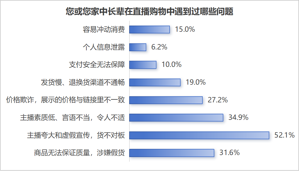 無錫市消費者權(quán)益保護委員會近日發(fā)布的一份《無錫市中老年網(wǎng)絡(luò)直播消費情況調(diào)查報告》顯示,近八成老人每3個月至少消費一次,單次最高消費集中在1000元—3000元。但其中有52.1%的受訪者遭遇過貨不對板、虛假宣傳的問題。