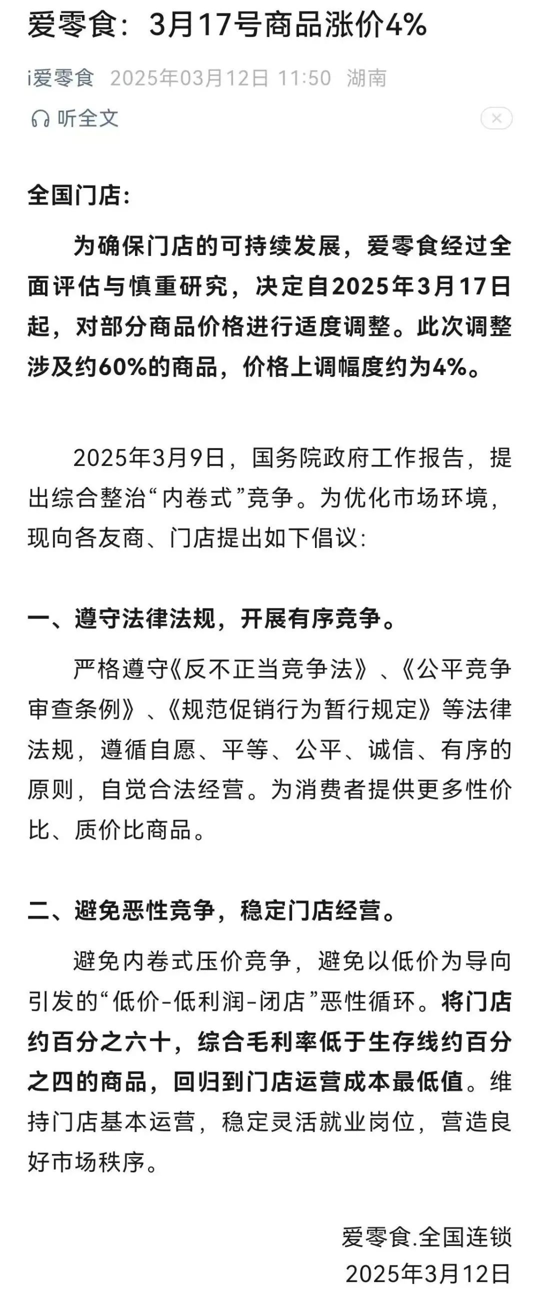 愛零食同時(shí)也表示,避免內(nèi)卷式壓價(jià)競(jìng)爭(zhēng),避免以低價(jià)為導(dǎo)向引發(fā)的“低價(jià)-低利潤-閉店”惡性循環(huán)。將門店約百分之六十,綜合毛利率低于生存線約百分之四的商品,回歸到門店運(yùn)營成本最低值。維持門店基本運(yùn)營,穩(wěn)定靈活就業(yè)崗位,營造良好市場(chǎng)秩序。