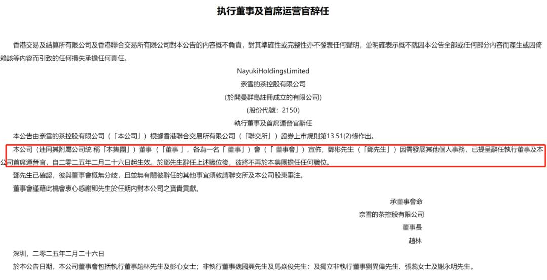 2月26日,奈雪的茶發(fā)布公司重大人事變動公告,公告稱公司執(zhí)行董事兼首席運營官鄧彬離職,離職原因是“因需發(fā)展其他個人事務”,且自公告之日起生效。公告還強調鄧彬辭任上述職位后,彼將不再擔任奈雪的茶任何職位。
