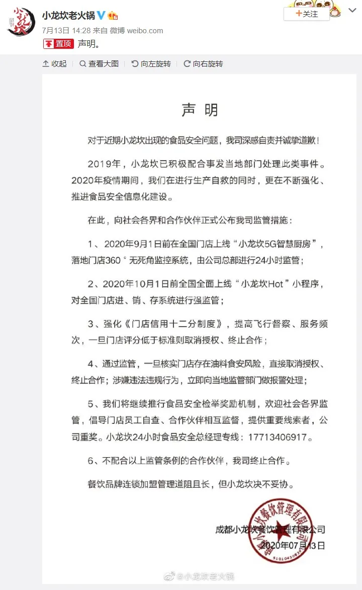 2018年5月28日,小龍坎在官方微博就此事發(fā)出聲明,稱對所有門店加強(qiáng)管理,“一旦查實(shí)上述門店存有食品安全問題,絕不姑息”。