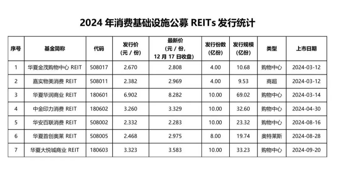 2024年我國(guó)首次公開(kāi)發(fā)行消費(fèi)基礎(chǔ)設(shè)施公募REITs。3月至9月間,華夏金茂購(gòu)物中心REIT、嘉實(shí)物美消費(fèi)REIT、華夏華潤(rùn)商業(yè)REIT、中金印力消費(fèi)REIT、華安百聯(lián)消費(fèi)REIT、華夏首創(chuàng)奧萊REIT、華夏大悅城商業(yè)REIT分別在上交所與深交所上市。