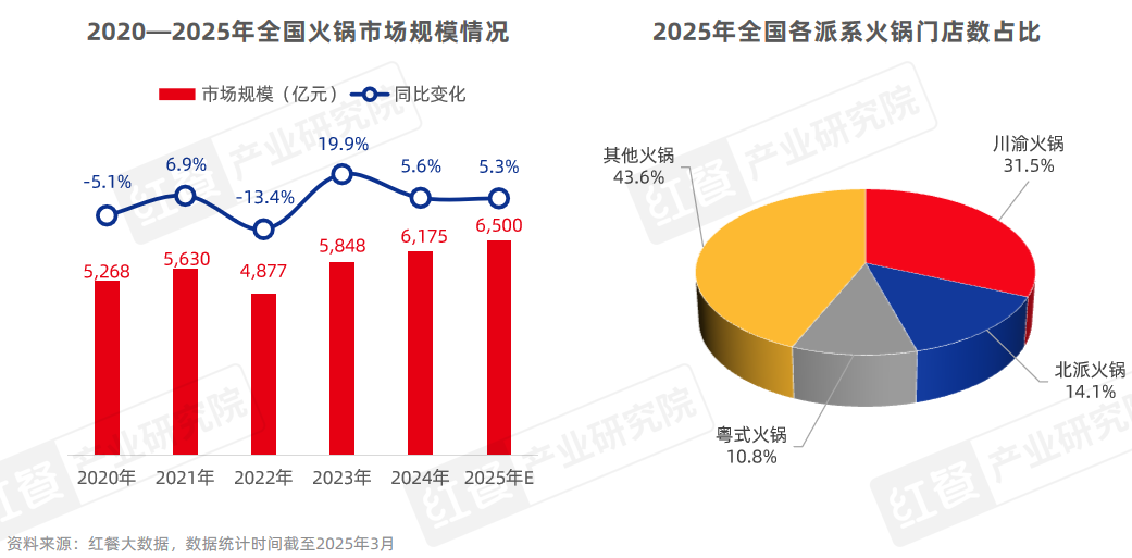 2024—2025年,全國火鍋總門店數(shù)穩(wěn)定在50萬家以上,市場規(guī)模延續(xù)增長態(tài)勢。據(jù)紅餐大數(shù)據(jù),2024年全國火鍋的市場規(guī)模為6,175億元,同比增長6.8%,預計2025年市場規(guī)模將達到6,500億元。