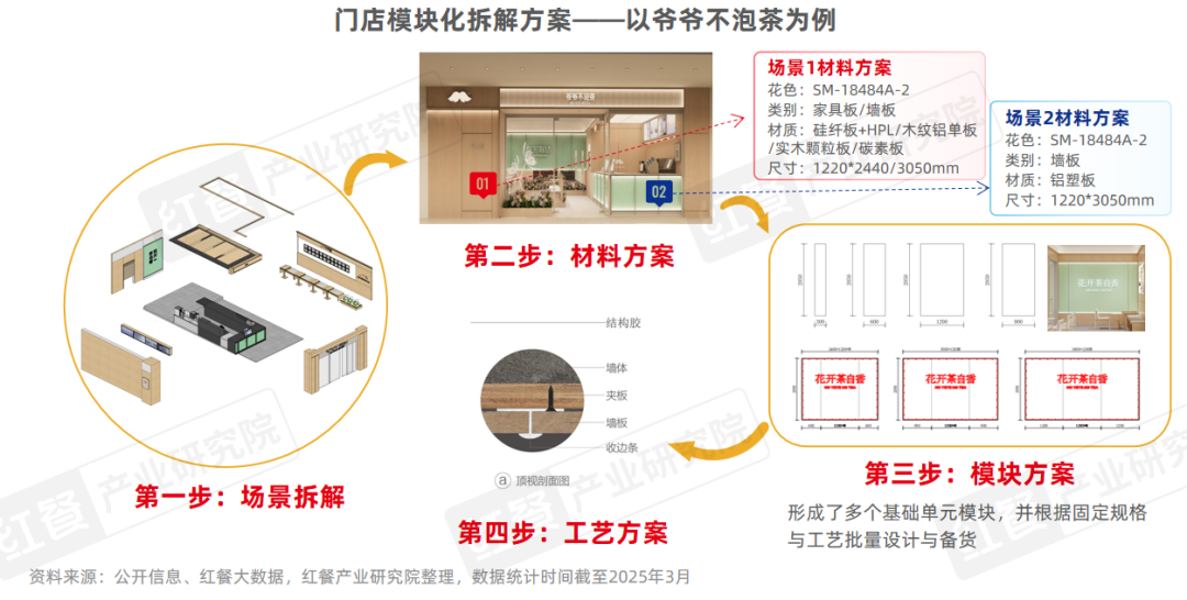 以茶飲品牌爺爺不泡茶為例,其采用朗生模塊化、預制化的門店營建方案后,門店設(shè)計周期縮短了50%以上,現(xiàn)場制作占比從傳統(tǒng)施工的75%降至40%,同時安裝工時減少了75%,較大幅度提升了門店營建效率。紅餐大數(shù)據(jù)顯示,截至2025年3月,爺爺不泡茶的門店數(shù)已超過了1,500家。