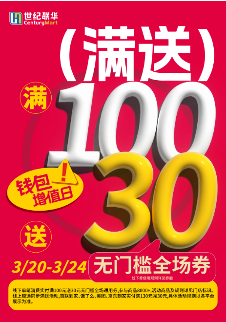 3月20日-3月24日,世紀(jì)聯(lián)華聯(lián)合食品、日化、家百等領(lǐng)域品牌供應(yīng)商,精挑細(xì)選8000多款商品讓利,推出“錢包增值日”活動(dòng)。消費(fèi)者在上海世紀(jì)聯(lián)華,單筆實(shí)付滿100元,即可獲贈(zèng)30元無門檻全場通用券,活動(dòng)品類涵蓋:米面糧油、洗化紙品、休閑零食、飲料酒水、家用清潔和個(gè)護(hù)美妝等眾多分類。