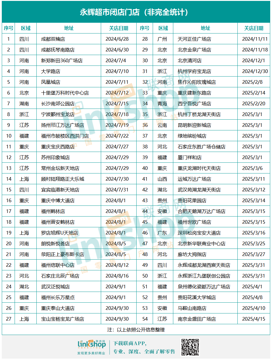 而調(diào)改的同時(shí),網(wǎng)點(diǎn)資源布局優(yōu)化也在不斷加速。2024年下半年,永輝至少關(guān)閉超過30家門店,而到2025年2-4月份,據(jù)公開信息整理統(tǒng)計(jì),確定閉店23家。