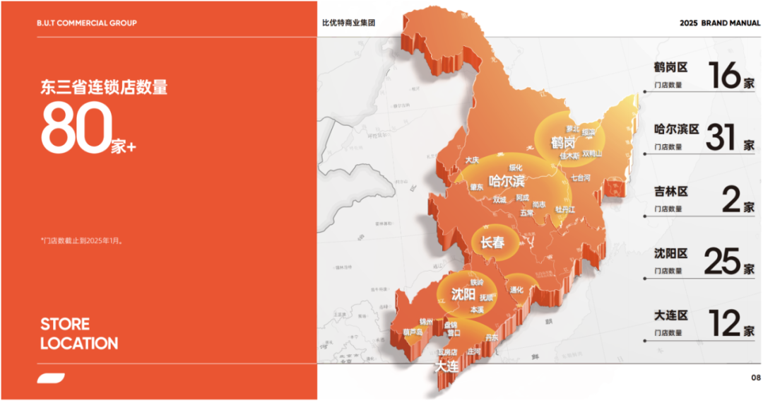 官網(wǎng)顯示,截至目前,比優(yōu)特已經(jīng)在東北地區(qū)開設(shè)“比優(yōu)特超市”連鎖門店85家,總經(jīng)營(yíng)面積達(dá)50多萬㎡,門店遍布東北三省24個(gè)城市。僅僅2024年,比優(yōu)特就開店21家。