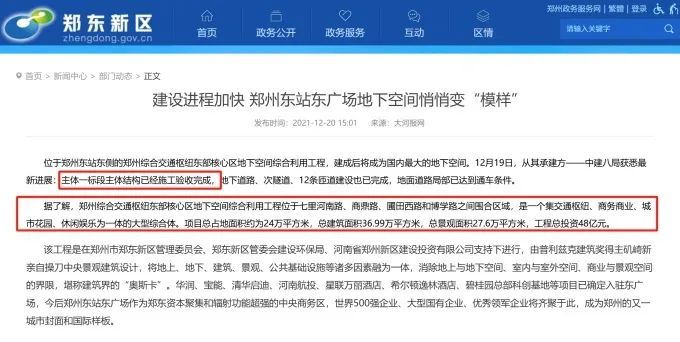按照大河報(bào)網(wǎng)消息,項(xiàng)目所在地屬于鄭州東站東側(cè)的鄭州綜合交通樞紐東部核心區(qū)地下空間綜合利用工程,建成后將成為國(guó)內(nèi)最大的地下空間。2021年已經(jīng)完成一標(biāo)段主體結(jié)構(gòu)。