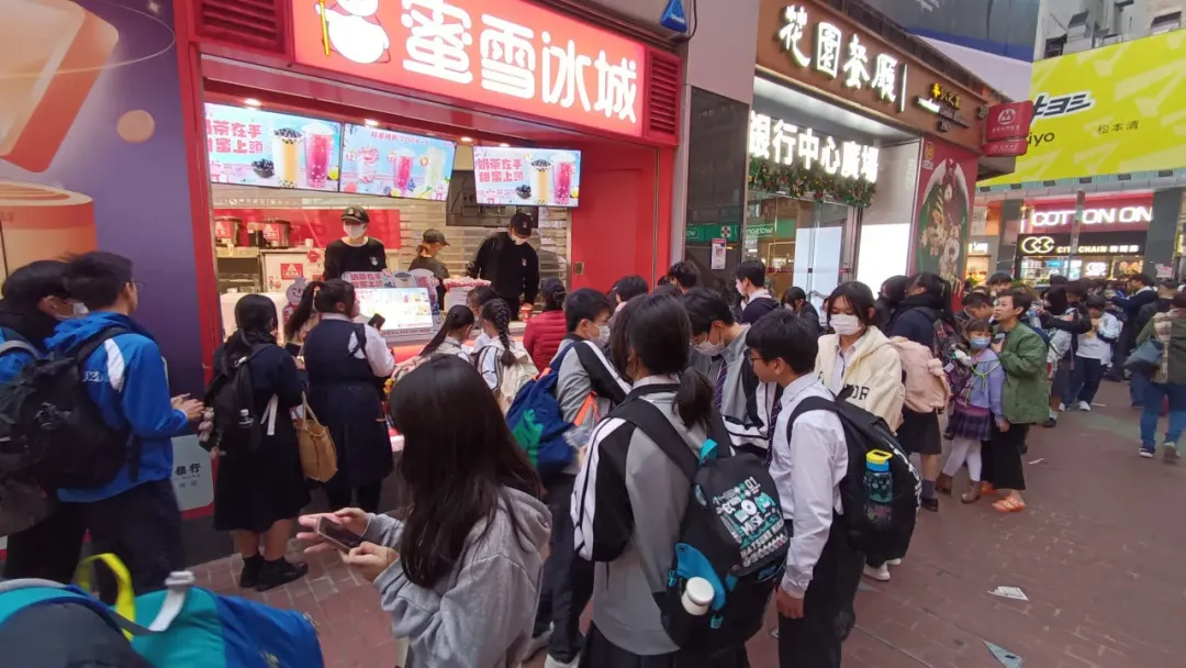 圖:蜜雪冰城旺角分店門口排起了長隊,又便宜又甜的奶茶,自然是學(xué)生的最愛