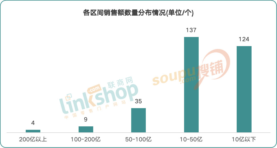 10-50億區(qū)間占比多主要是因為一站式綜合性購物中心模式是當(dāng)下的主流商業(yè)形態(tài),這些大眾時尚型商場有一定的體量,在區(qū)域有一定的影響力,加上日常頻繁的營銷活動,往往有相對不錯的銷售額。如果有山姆會員店等強(qiáng)主力店的加持,基本就具備了突破50億的實力。