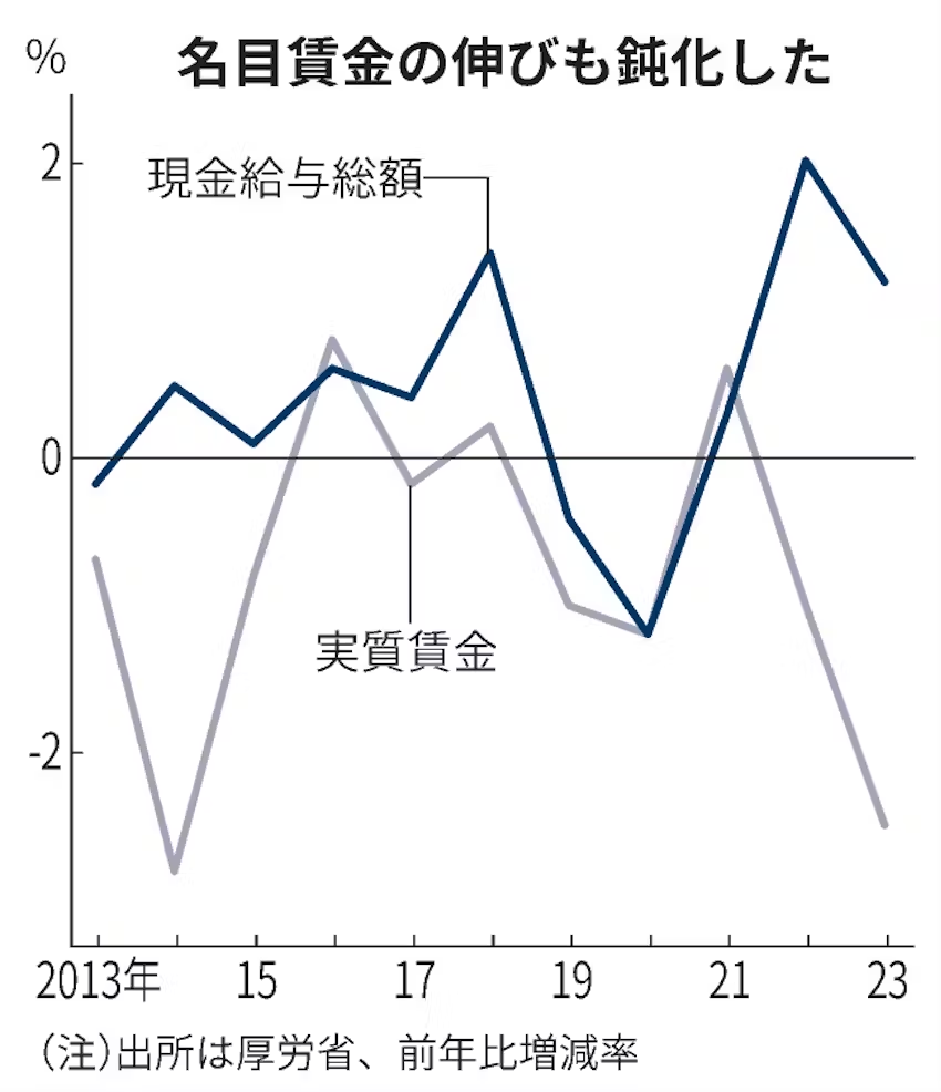 日本人的實(shí)際薪資創(chuàng)1990年以來最低水平(圖源:日本經(jīng)濟(jì)新聞)