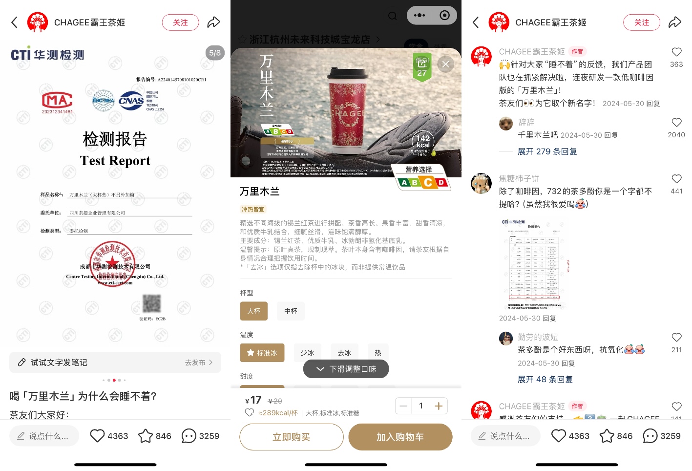 回顧霸王茶姬的低因產(chǎn)品發(fā)展史,可以看到它始終秉持著傾聽消費者聲音、真誠回應、采取實際舉措的態(tài)度。在萬里木蘭因提神效果過強而出圈后,霸王茶姬72小時內(nèi)公布咖啡因檢測報告,迅速在產(chǎn)品介紹中增添了相關提示。同時,還在社交平臺上積極回應消費者需求,表示正在緊鑼密鼓地研發(fā)低咖啡因版本。如今,輕因·伯牙絕弦已正式上線,0咖啡因產(chǎn)品也在緊鑼密鼓地籌備中。