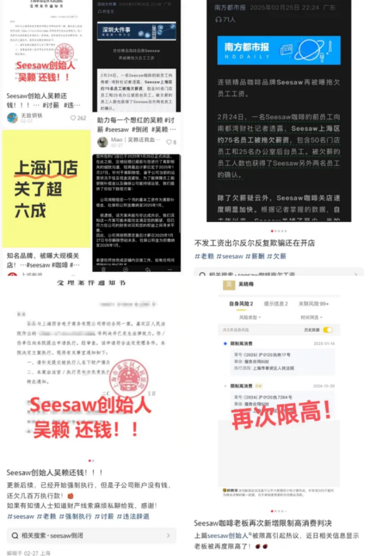 其中,Seesaw咖啡首當(dāng)其沖。2月24日,有媒體曝光Seesaw拖欠上海區(qū)員工薪資,事件迅速登上熱搜。隨后,大量自稱Seesaw前員工的網(wǎng)友在 小紅書 平臺(tái)集體討薪,并爆料稱“創(chuàng)始人已被強(qiáng)制執(zhí)行”“拖欠執(zhí)行款高達(dá)百萬(wàn)”等。