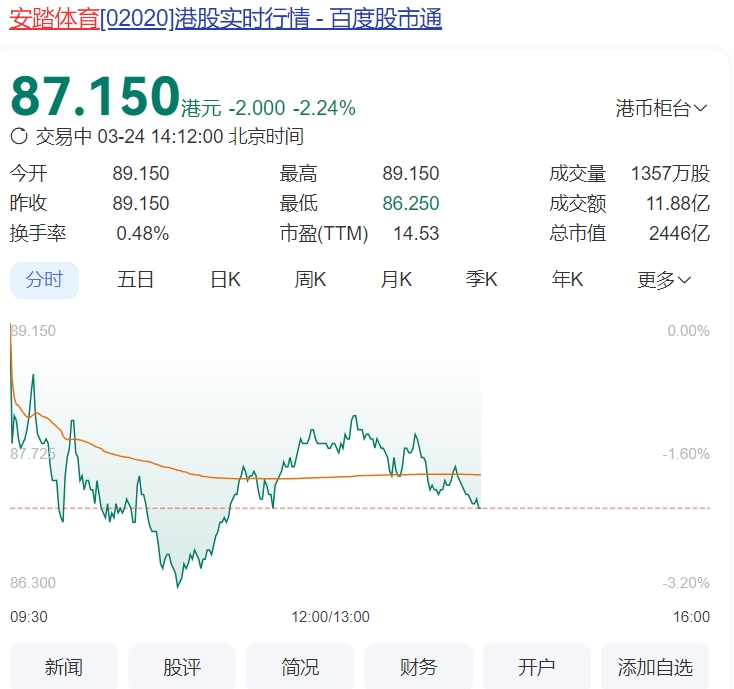 安踏體育財報發(fā)布后,股價一直處于下跌態(tài)勢,截至今日14時左右,安踏體育股價為87.15元/股,市值為2446億港元,相較3月19日最高點的103.8港元/股,股價下滑幅度達16%。