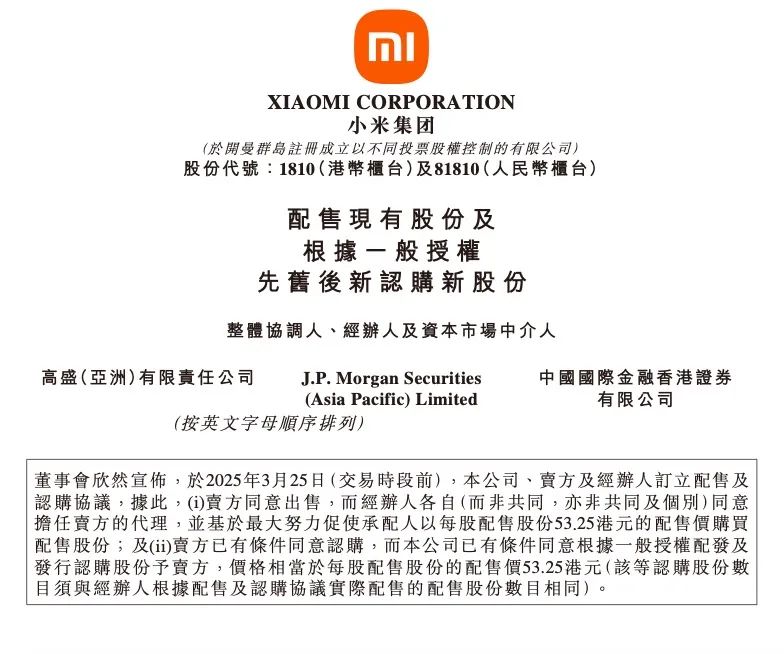 3月25日,小米集團(tuán)在港交所發(fā)布公告,擬配售8億股現(xiàn)有股份,占公司已發(fā)行股本約3.2%。預(yù)計籌資凈額約425億港元,用于業(yè)務(wù)擴(kuò)張、研發(fā)投資及其他一般用途。