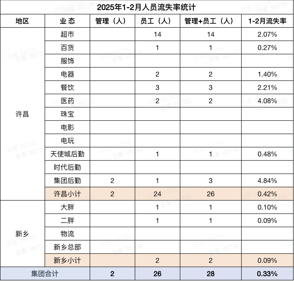 2025年1-2月,胖東來集團(tuán)流失了28人,其中包括2名管理人員及26名員工,人員流失率僅為0.33%。