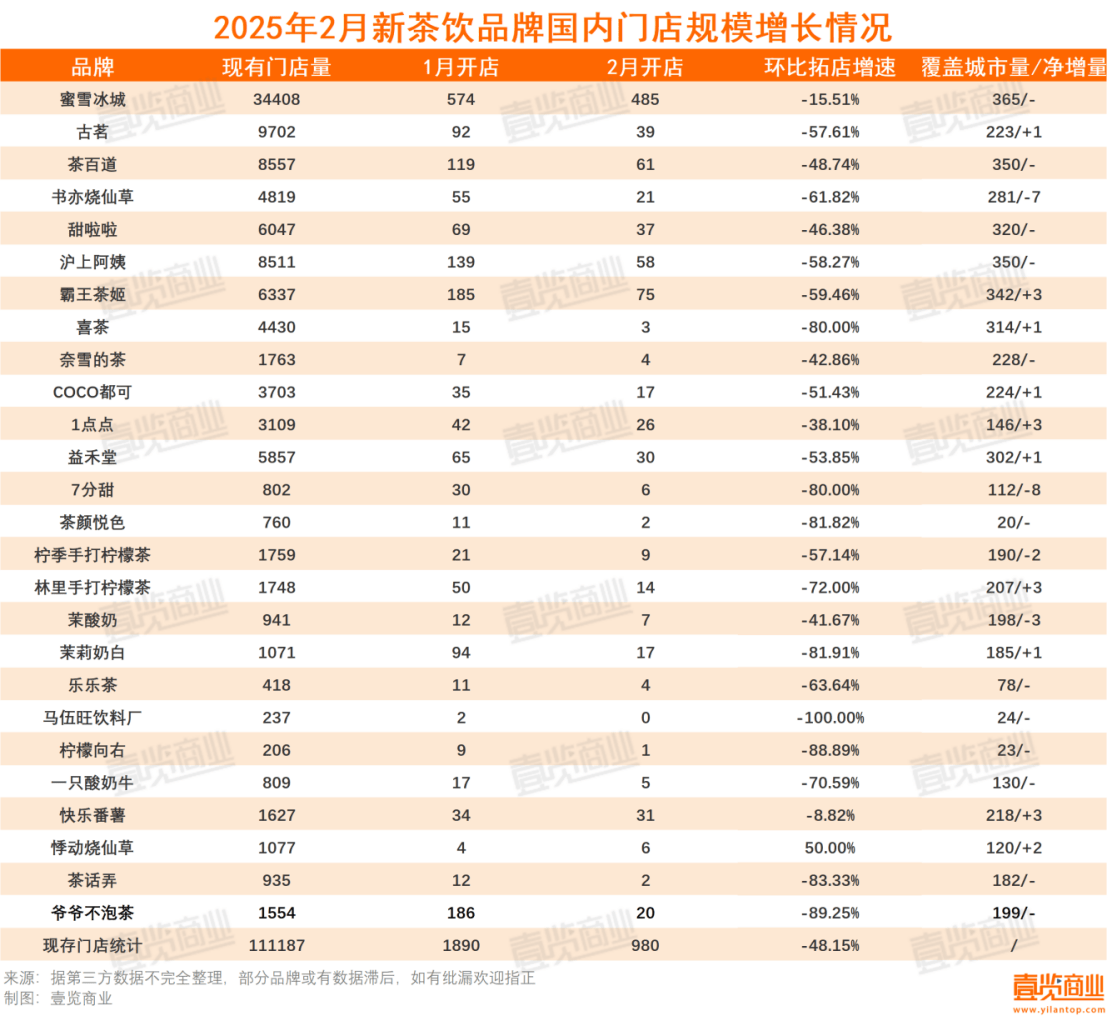 從整體開店情況來看,2025年2月,國內26家連鎖茶飲品牌共新開門店980間,同比減少17.57%。行業(yè)擴張步伐明顯放緩,F(xiàn)存門店總數(shù)達到111187間,同比減少3.15%。