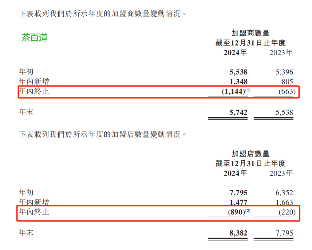 茶百道的門店增速也明顯放緩,2024年末為8395家,凈增594家。期內(nèi),新開加盟門店1477家,同時,終止的門店數(shù)量高達890家,是上年同期的4倍多。