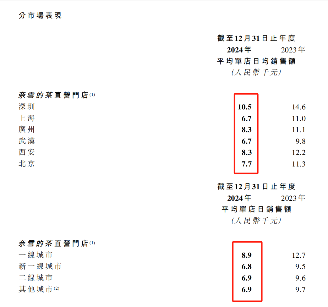 主打高端市場的奈雪的茶,經(jīng)營更不樂觀。2023年,其一線、新一線、二線及其他城市門店日均銷售額分別為1.27萬元、9500元、9600元和9700元,到2024年,已分別降至8900元、6800元、6900元和6900元。上述,都是奈雪的茶直營店數(shù)據(jù)。公司重投入開店,運營狀況下滑若此,怎么可能不虧損?
