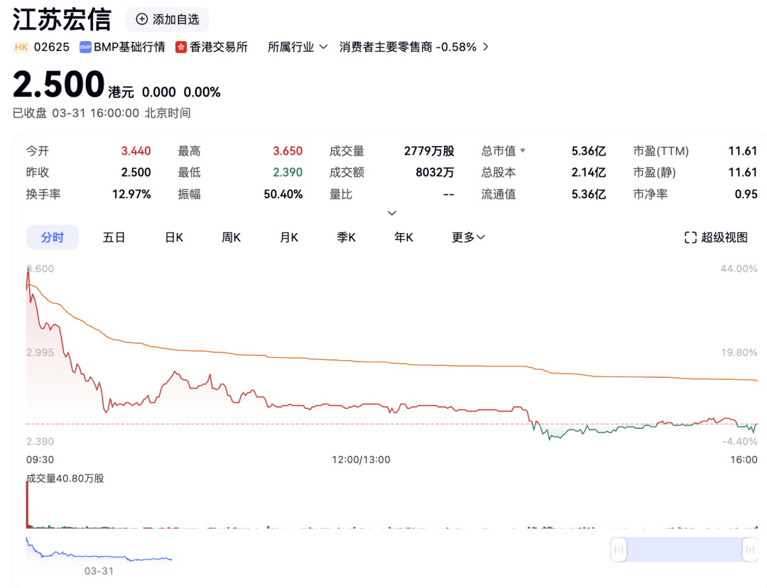 3月31日,江蘇宏信超市連鎖股份有限公司(股票代碼:2625.HK,以下簡稱“宏信超市”)以“蘇中超市第一股”的身份登陸港交所,募資約1.5億港元。當日,江蘇宏信以3.44港元/股開盤,并摸高至3.65港元/股,此后下探甚至一度跌破2.50港元/股的發(fā)行價,截至收盤,換手率12.97%,港股市值5.36億港元。