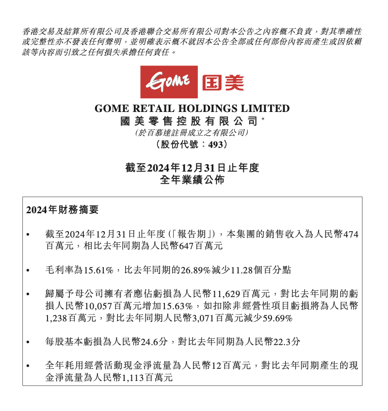 3月31日,國美零售公布截至2024年12月31日止年度全年業(yè)績。