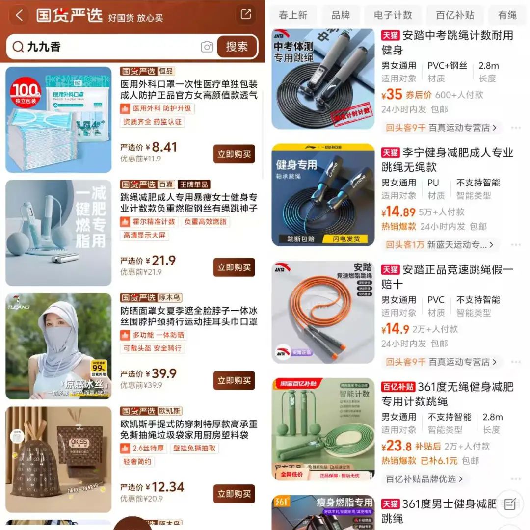 譬如,一款品牌跳繩商品,不僅會標有“國貨嚴選+品牌”的標志,還會在商品簡介中附帶有“霍爾精準計數(shù)”、“負重高效燃脂”、“高清顯示大屏”等標識,這些標識可以進一步體現(xiàn)出商品的嚴選指標,吸引用戶購買。