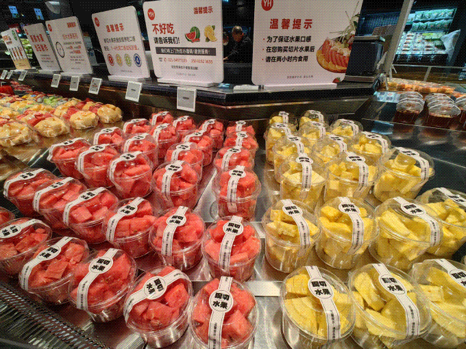 熱帶水果柜增設(shè)貓山王榴蓮、智利車(chē)?yán)遄拥雀呷藲鈫纹,吸引年輕家庭駐足。各種水果的糖度、產(chǎn)地標(biāo)識(shí)明顯,也進(jìn)一步激發(fā)了用戶(hù)的消費(fèi)信任感。鮮度上,新鮮果切現(xiàn)場(chǎng)明檔,顧客可以看見(jiàn)員工加工用料,并且成品嚴(yán)格執(zhí)行“468”原則:超4小時(shí)八折、6小時(shí)六折、8小時(shí)下架;草莓等嬌嫩品實(shí)行“當(dāng)日清空”。
