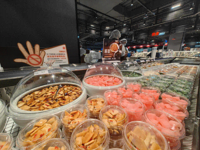 熟食烘焙方面,提供多款網(wǎng)紅爆款與老上海情懷商品。熟食區(qū)推出“胖東來(lái)同款”小紅腸,秘制牛肉條、韓式炸雞、烤鴨,并全新引入了紫燕百味雞。明檔廚房,顧客可以看見(jiàn)員工操作行為,營(yíng)造了更為放心的消費(fèi)現(xiàn)場(chǎng)。