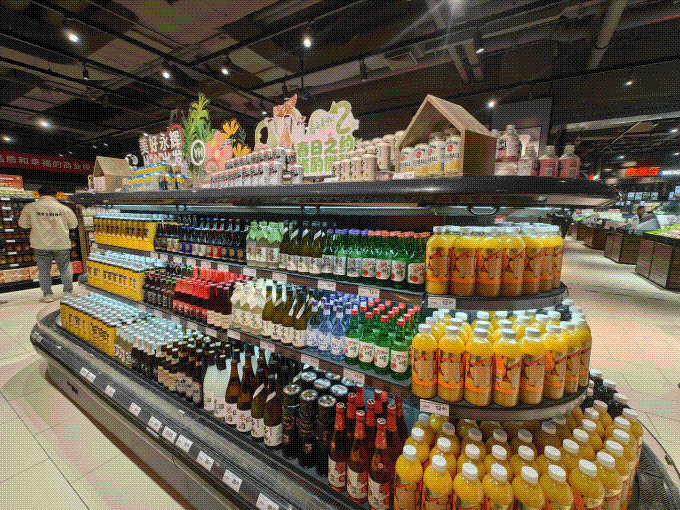在品類(lèi)過(guò)渡上,延續(xù)和傳承了胖東來(lái)式的科學(xué)設(shè)置,入口處的左手邊的烘焙、水果,使顧客一進(jìn)場(chǎng)就能被調(diào)動(dòng)味蕾體驗(yàn)和視覺(jué)享受,右手邊的胖東來(lái)自有品牌專(zhuān)區(qū)又能激發(fā)信任和品質(zhì)心智,后續(xù),人間煙火的熟食、琳瑯滿(mǎn)目的冷藏乳飲、鮮活生猛的水產(chǎn)海鮮等依次展開(kāi),每個(gè)品類(lèi)都最大程度的釋放了其特色和亮點(diǎn);而綜合考慮品類(lèi)特性,瓷器碗碟被安置與動(dòng)線(xiàn)末端,并提供了包扎服務(wù),細(xì)節(jié)滿(mǎn)滿(mǎn)。