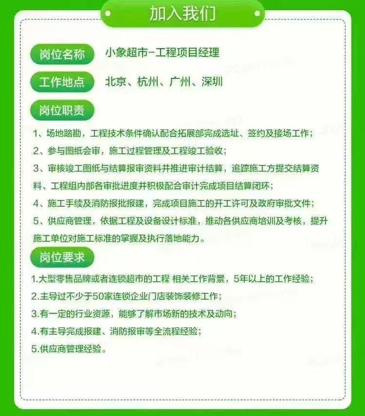 有了小象生鮮的前車之鑒,小象超市這一輪的開店策略也變得更謹慎、更專業(yè),比如小象超市對項目工程經(jīng)理的要求是:不少于50家連鎖企業(yè)門店裝飾裝修工作、有供應商管理經(jīng)驗等。