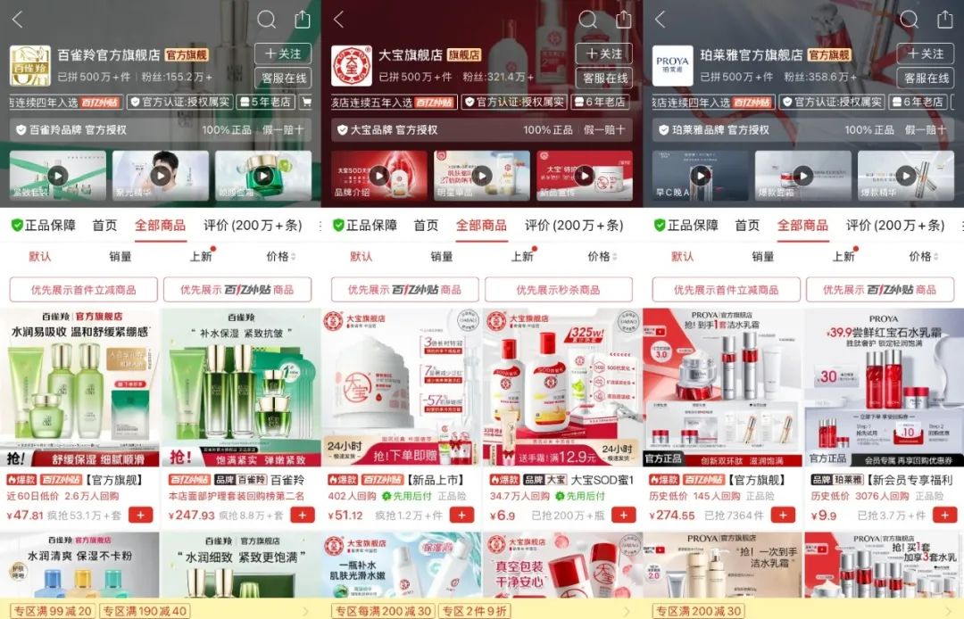 目前,已經(jīng)有大量美妝品牌正式入駐拼多多,例如品牌榜第一的百雀羚,其官方旗艦店共有粉絲155.2萬+,第二名和第三名的珀萊雅及大寶官方旗艦店粉絲均超過300萬。