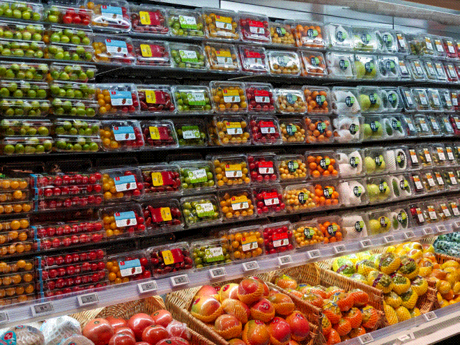 生鮮方面,門店在商品品質(zhì)和品類豐富度方面進一步優(yōu)化提升。肉禽板塊,引進了優(yōu)質(zhì)黑豬肉、貴州小黃牛等品類;水果板塊,增加了水果撈,果汁、果茶等品類;蔬菜板塊,為了保證安全衛(wèi)生,蔬菜葉菜、豆制品、分切菜全部以精包的方式在低溫柜陳列銷售;水產(chǎn)板塊,也極大豐富了品類,從新西蘭翡翠鮑到紅毛蟹、皇帝蟹、大紅龍蝦,應有盡有。