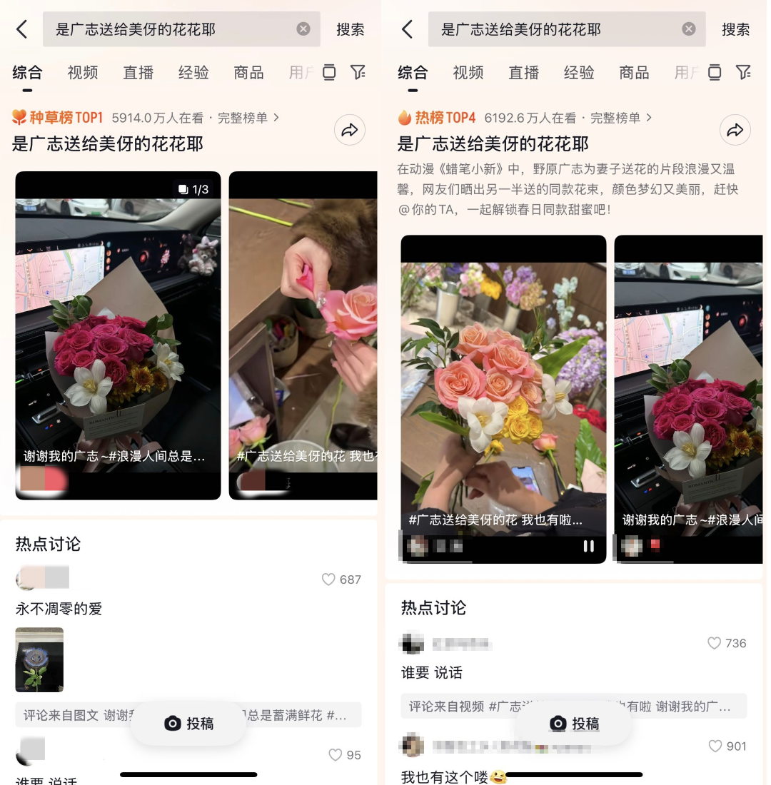 根據(jù)抖音數(shù)據(jù)顯示,話題#是廣志送給美伢的花花耶 ,上線當天便登上了抖音熱榜top2與抖音種草榜top1。與此同時,平臺也出現(xiàn)了同款花束小時達等SEO話題,進一步激發(fā)用戶的購買熱情。