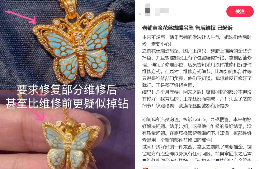 社媒平臺上還有網(wǎng)友表示反復(fù)維修后不滿意、甚至嘗試起訴維權(quán)。有網(wǎng)友表示在老鋪黃金購入一款花絲蝴蝶吊墜,由于吊墜翅膀有些許掉色和疑似掉鉆的情況,拿去店鋪修理,但幾個(gè)月等待拿回手中之后,發(fā)現(xiàn)疑似掉鉆的部分不但沒有修好,背后的手工花絲反而糊成一片,沒了以前的細(xì)節(jié)和紋路;門店無法解決此事,因此向法院提起訴訟。
