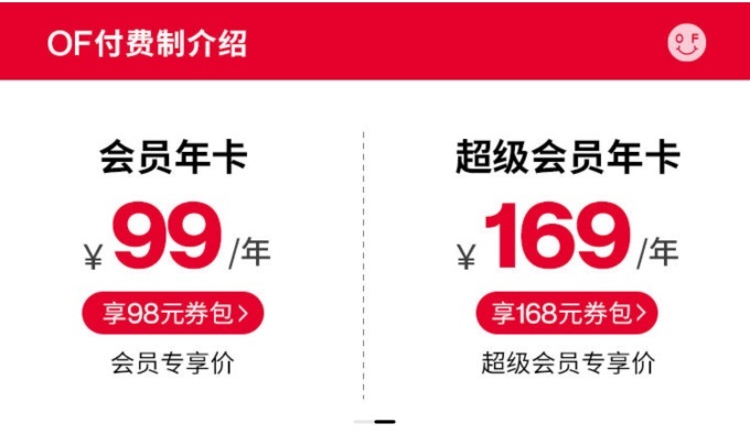根據(jù)OF官方微信,OF推出付費(fèi)會員,其中會員年卡99元,超級會員年卡169元。