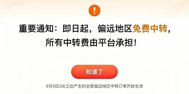 針對(duì)9月9日3點(diǎn)起產(chǎn)生的全部偏遠(yuǎn)地區(qū)中轉(zhuǎn)訂單,商家只需將訂單發(fā)送至中轉(zhuǎn)倉(cāng),后續(xù)將訂單從中轉(zhuǎn)倉(cāng)轉(zhuǎn)運(yùn)至新疆、西藏、甘肅、寧夏、內(nèi)蒙古等偏遠(yuǎn)地區(qū)的二次物流費(fèi)用,將全額由平臺(tái)承擔(dān)。