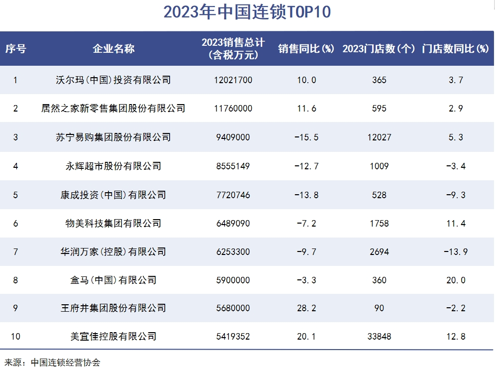 根據(jù)中國(guó)連鎖經(jīng)營(yíng)協(xié)會(huì)的統(tǒng)計(jì),2023年連鎖百?gòu)?qiáng)中,傳統(tǒng)零售龍頭永輝、大潤(rùn)發(fā)、物美、華潤(rùn)萬家均出現(xiàn)銷售額大幅下滑的景象。而另一方面,有山姆支撐的沃爾瑪、胖東來、Costco中國(guó)、信譽(yù)樓百貿(mào)等特色零售商則逆勢(shì)增長(zhǎng)。