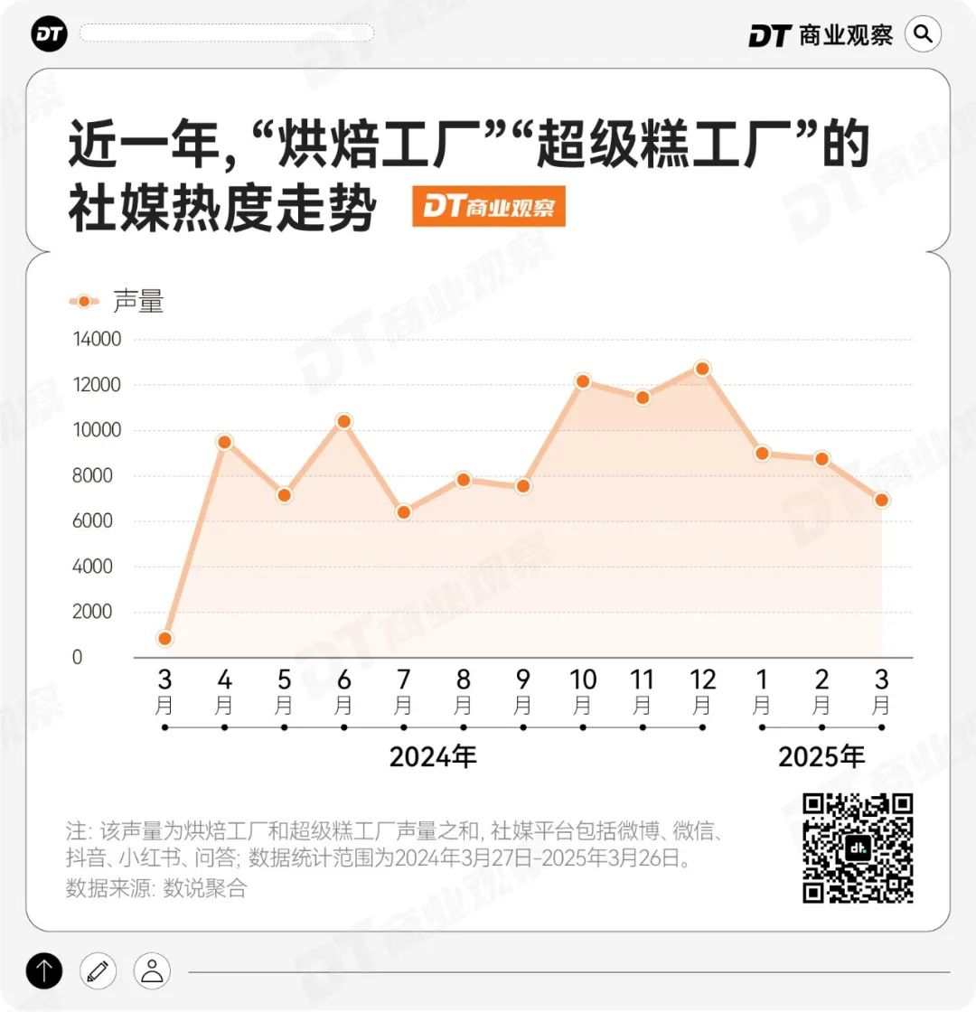 從2024開始,“烘焙工廠”在社交媒體上的聲量不斷攀升,去年年底,一批新品牌入場(chǎng)開設(shè)首店,把烘焙工廠的聲量推到峰值,2025年初,雖然社媒聲量有所回落,但還是遠(yuǎn)超2023年。