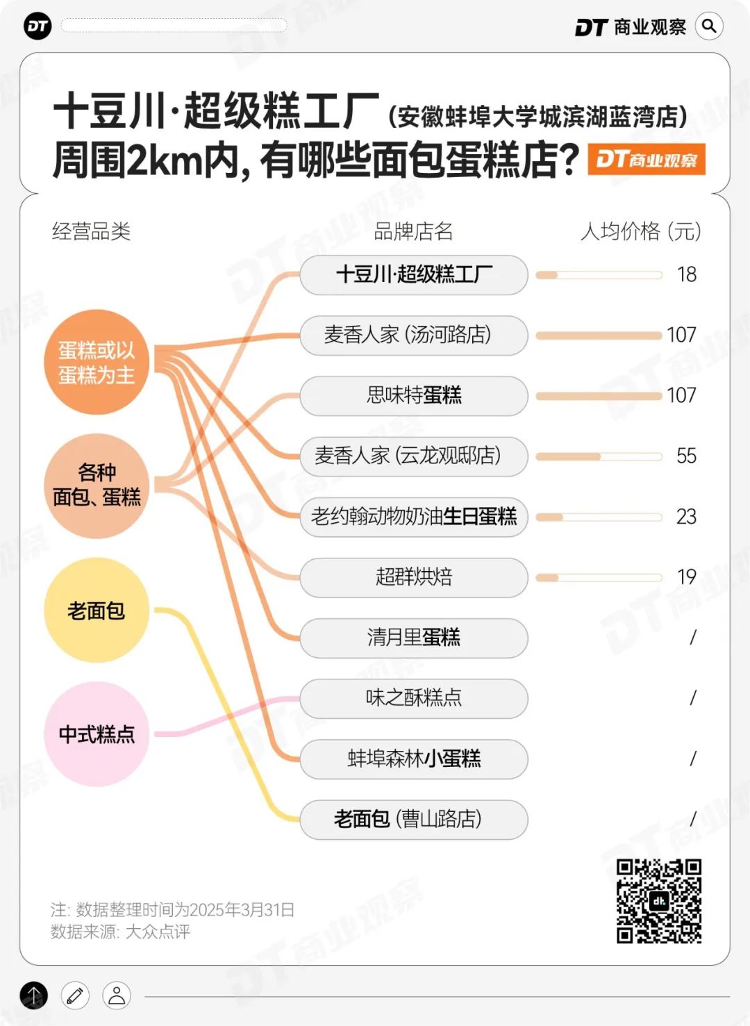 以十豆川超級(jí)糕工廠在安徽蚌埠的大學(xué)城店為例,該門店2km范圍內(nèi)面包烘焙店一共有9家,其中5家都是以蛋糕為主要品類,1家是中式糕餅店、1家專注賣老面包,剩下兩家雖然品類多,但人均價(jià)格均高于十豆川。