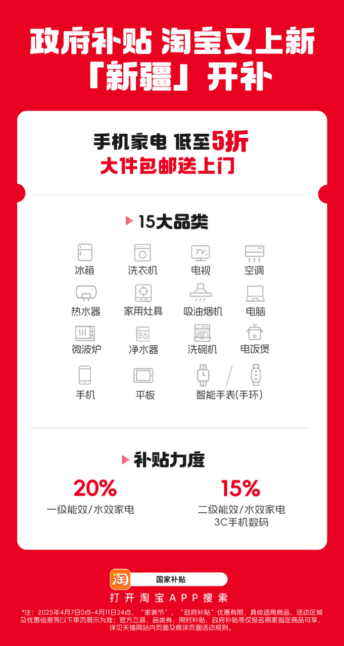 新疆消費者在淘寶App搜索“國家補(bǔ)貼”即可直達(dá)國補(bǔ)專享頁,參與天貓“春季家裝節(jié)”活動,享受雙重補(bǔ)貼低至5折優(yōu)惠!大件還包郵送上門!