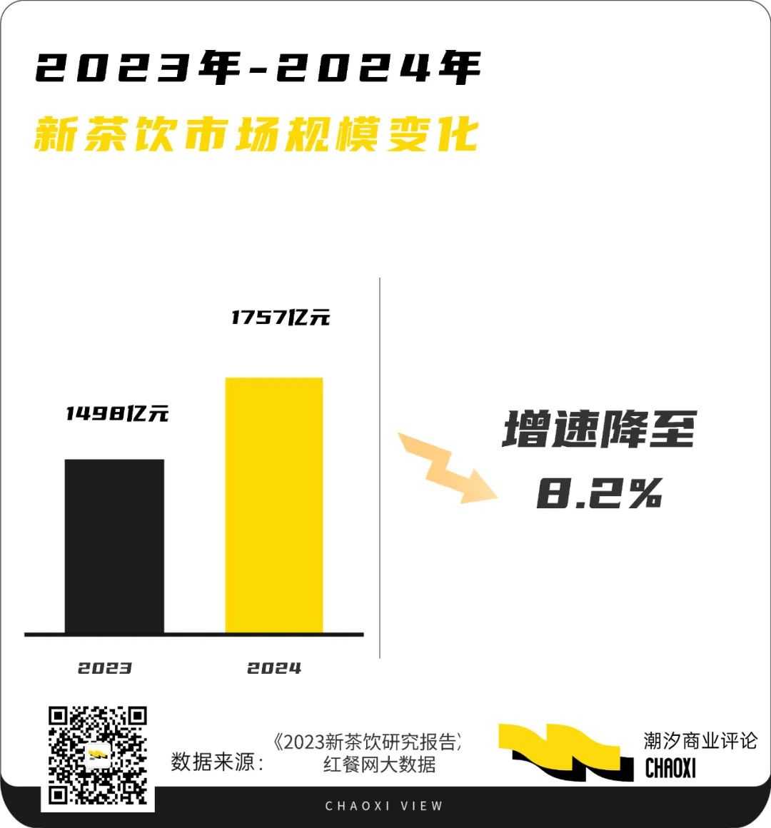根據(jù)《2023新茶飲研究報告》顯示,新茶飲市場2023年市場規(guī)模預(yù)計達(dá)到1498億元,并且連鎖化率整體穩(wěn)定。然而,盡管市場規(guī)模在擴(kuò)大,但增速有所放緩。紅餐大數(shù)據(jù)顯示,預(yù)計2024年市場規(guī)模為1757億元,增速降至8.2%。