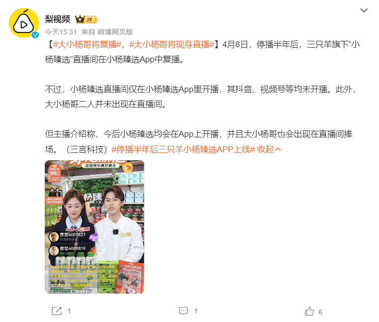 小楊臻選APP上線,被外界視為三只羊復(fù)播的信號(hào),如今三只羊集團(tuán)工作人員的回應(yīng)驗(yàn)證了這一點(diǎn),但是網(wǎng)友們對(duì)此看法不一。有網(wǎng)友期待三只羊的回歸,“做大做強(qiáng)再創(chuàng)輝煌,做精做細(xì)重新起航”;也有網(wǎng)友擔(dān)心服務(wù)質(zhì)量,“會(huì)不會(huì)是換湯不換藥”。