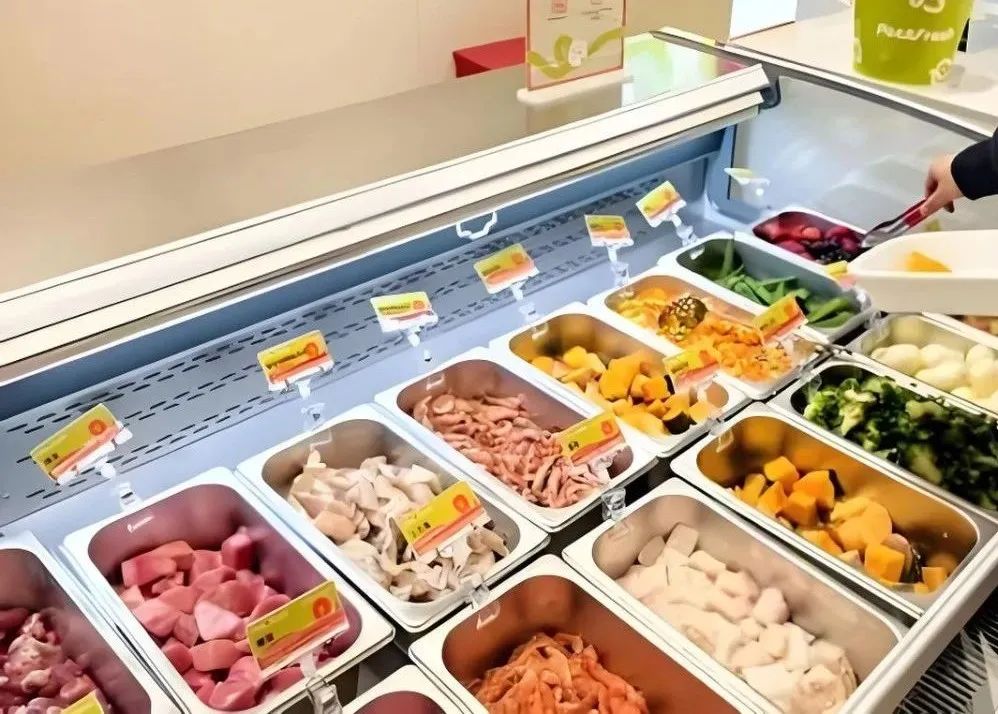 當(dāng)公共服務(wù)領(lǐng)域邁出這一步時(shí),商業(yè)世界早已掀起更深層的變革。當(dāng)筆者走進(jìn)「派特鮮生」,生骨肉、三文魚沙拉與寵物生日蛋糕擠滿冷柜,定制熱食區(qū)飄出雞胸肉的烘焙香氣。這個(gè)對(duì)標(biāo)盒馬的新零售樣本,正用“鮮食革命”重構(gòu)寵物消費(fèi)場(chǎng)景,將“毛孩子經(jīng)濟(jì)”推至新維度。