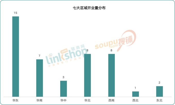 從七大區(qū)域的分布情況上看,華東區(qū)新開數(shù)量15個,體量80.83萬㎡;華南區(qū)新開數(shù)量7個,體量43.55萬㎡;華中區(qū)新開數(shù)量3個,體量14.5萬㎡;華北新開數(shù)量8個,體量83.5萬㎡;西南新開數(shù)量8個,體量50.17萬㎡;西北新開數(shù)量1個,體量6萬㎡;東北新開數(shù)量2個,體量5萬㎡。