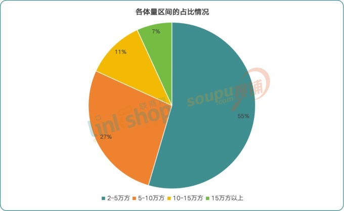 從各個區(qū)間的體量分布上看,規(guī)模在2-5萬m²(含2萬m²,不含5萬m²)的項目數(shù)量最多,達24個,占比超一半至55%;規(guī)模在5-10萬m²(含5萬m²,不含10萬m²)的項目有12個,占比約27%;規(guī)模在10-15萬m²(含10萬m²,不含15萬m²)的項目有5個,占比約11%;規(guī)模在15萬m²以上(含15萬m²)的項目有3個,占比均7%。